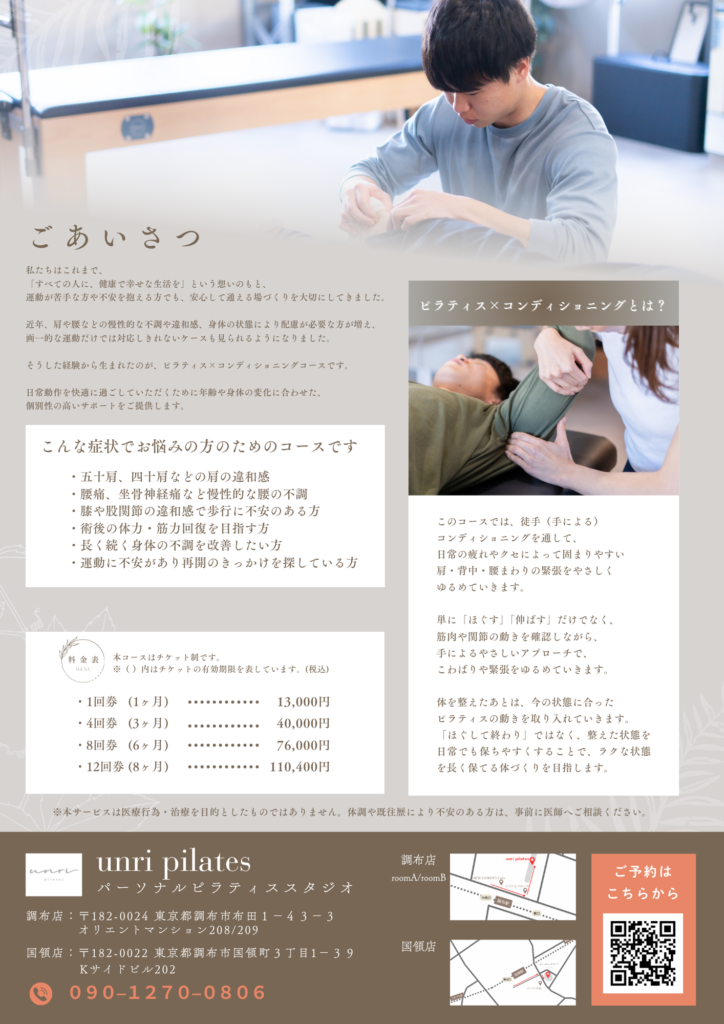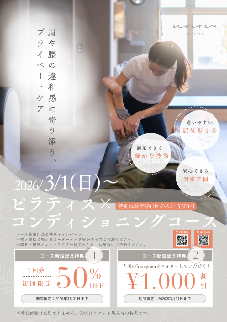 top 【お友達紹介キャンペーン実施中】 ▲ご紹介頂いた会員様に最大8,000円の割引!! ▲お友達は体験レッスン料5500円が実質無料!! ※会員様の種別によってキャンペーンの適用額や適用方法が異なります。詳しくはお問い合わせください。 Brand concept ”Unleash your potential” unri pilatesでは、お客様の潜在能力を最大限に引き出すことを目指しています。 多様な知識と経験を持つ専門のインストラクターが、お客様の目標に合わせたプログラムを提供することで ご自身の身体と心をより深く理解し、ピラティスを通じて成長し続けることができます。 What’s Pilates "無理のない安全なエクササイズ" ピラティスは、関節への負荷を最小限に抑えることを重視しています。正しいフォームと動きを意識することで、怪我や負担を軽減することができます。そのため、リハビリや身体の不調を抱えた人にも適しています。 年齢やフィットネスレベルに関係なく、誰にでも適しており、自分のペースに合わせて取り組むことができます。 元々の正しい位置に骨格が戻せれば 美しい姿勢が保てるようになり、きれいなボディラインを取り戻しもっと人生が楽しめるようになります。 Why Pilates "pilatesのメリット" ・姿勢の改善 ・柔軟性と可動域向上 ・産後の骨盤を整える ・運動の習慣がつく ・ストレスの軽減とリラック効果 Private Machine Pilates "インストラクターとマシンによる適切なサポート" 人目が気にならないプライベートな環境で、おもいっきりレッスンできます。 パーソナルな姿勢分析を行い、最適なエクササイズを提案します。 Machineは正しい方向に 導いてくれたり負荷を調節できるツール。 初心者ほどマシンから始め ましょう。 予約はオンラインで24時間受け付けています。 (※予約専用サイトに移動します。) 空席確認・予約する